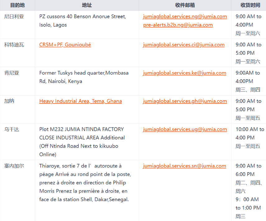 该网页主要呈现了 Jumia 海外仓仓库地址的相关信息,包括尼日利亚、科特迪瓦、肯尼亚、加纳、乌干达、塞内加尔等目的地的仓库地址、收件邮箱及收货时间,如尼日利亚仓库位于拉各斯,收件邮箱为 jumiaglobal.services.ng@jumia.com 等。同时还列出了退还产品给卖家时各国的仓库提货地址,这些信息为卖家在海外仓发货、退货等物流环节提供了关键的地址指引,确保物流流程的准确进行。
