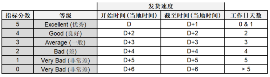 注: 1)D=订单生成当天; 2) D+X = D+X工作日; 3) 周末/法定节假日不计入发货速度。