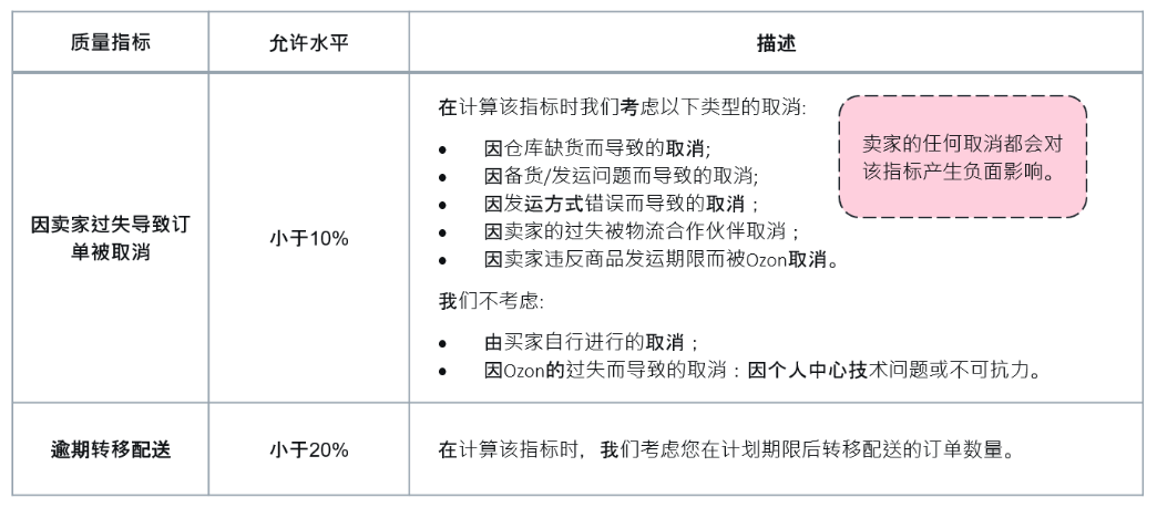 主要介绍了 Ozon 用于评估卖家工作质量的质量指标,包括逾期发运百分比、取消百分比、渠道错误,说明了因卖家过失导致订单被取消的允许水平及相关情况,逾期转移配送的允许水平,还提到这些数据对买家不可见对卖家可见,异常情况下 Ozon 可能提高指标上限,建议卖家追踪指标并保持在较高水平以避免封锁。