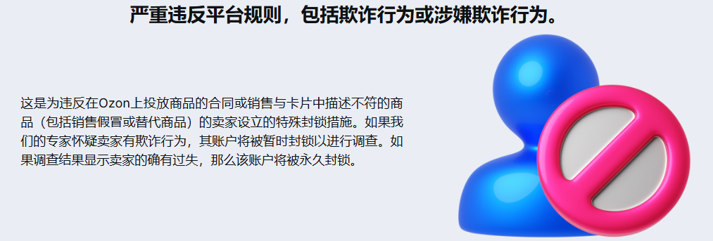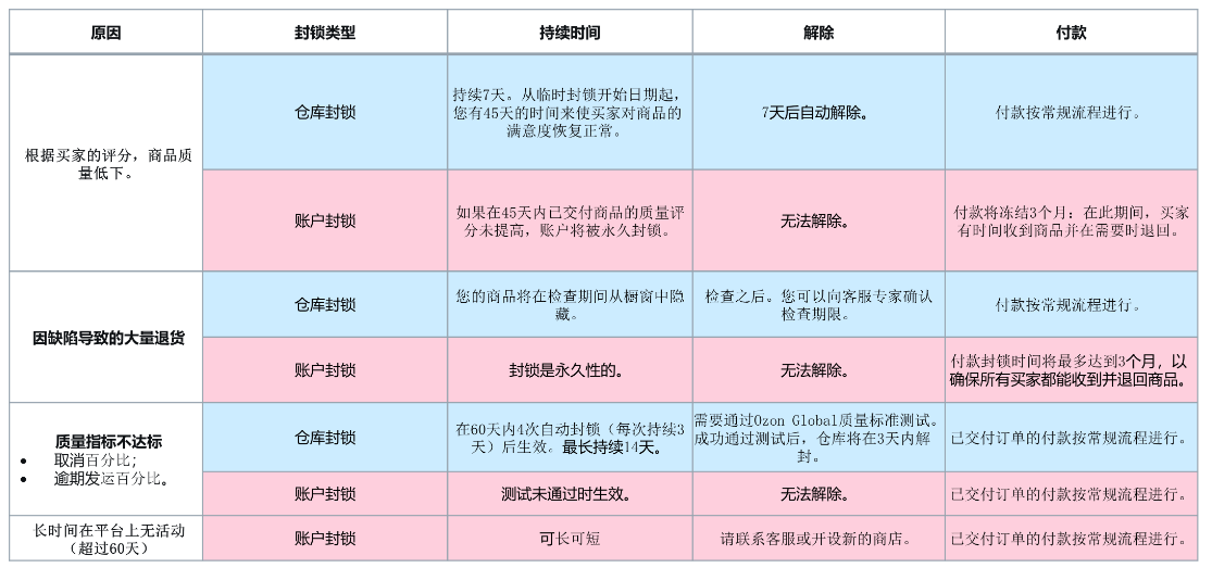 汇总了常见的封锁原因及相关信息,包括根据买家评分商品质量低下、因缺陷导致大量退货、Ozon Global 质量指标不达标、长时间在平台上无活动等,还详细说明了每种原因的具体情况,同时提到严重违反平台规则会被特殊封锁,此外对封锁类型、持续时间、解除方式和付款情况也进行了说明。
