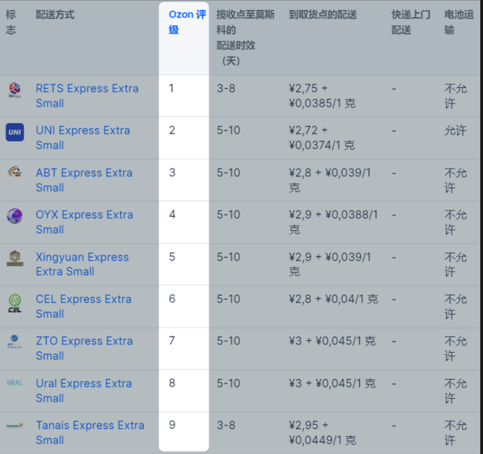 在Ozon合作伙伴物流文章中,在配送方式表格中出现了Ozon评级栏目,这是一个新的工具,它可以帮助您选择最佳的配送方式。