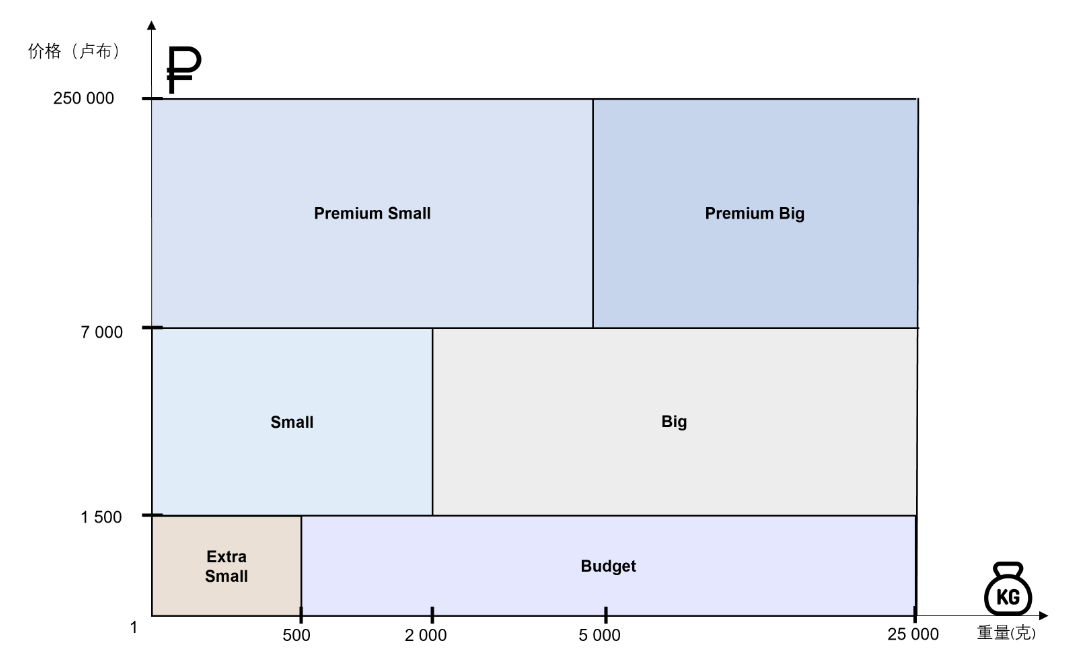 货件的配送费用取决于其中所含商品的总重量和价格。所有货件分为6组:Extra Small、Small、Budget、Big、Premium Small以及Premium Big。