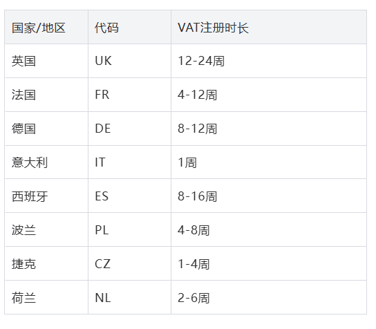 *3 获得VAT税号:VAT服务商将协助向对应政府提交VAT税号注册申请,审批通过后向卖家提供注册完成的VAT税号。值得注意的是,VAT注册时长依据不同国家/地区有所不同(下述表格所示注册时长供参考),但普遍周期较长,因此如果卖家有意经营欧洲站,需要提前准备。