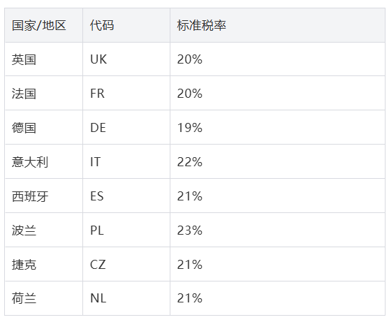 实际适用的增值税税率因不同的欧洲国家/地区(标准税率必须至少为 15%)和某些类型商品而有所不同。标准增值税税率是欧洲国家/地区对所有非免税商品和服务适用的税率,该税率不能低于 15%。此外,某些欧洲国家/地区还为特定商品保留了其他费率。