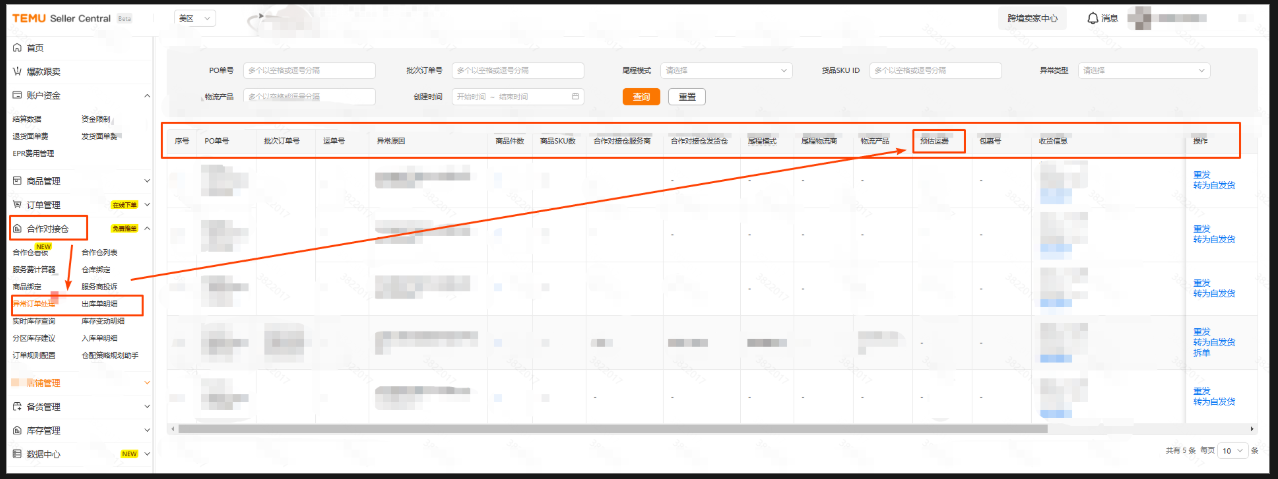 路径:卖家中心-合作对接仓-异常订单处理/出库单明细-选择尾程模式为平台面单