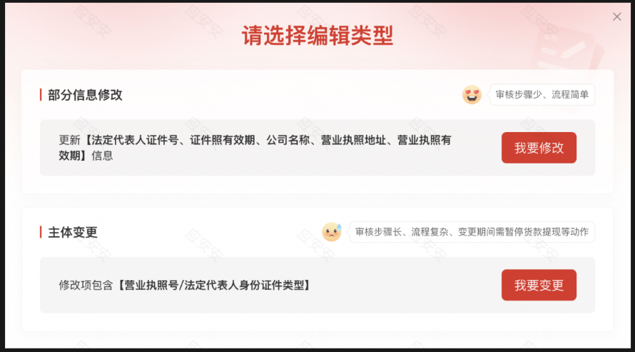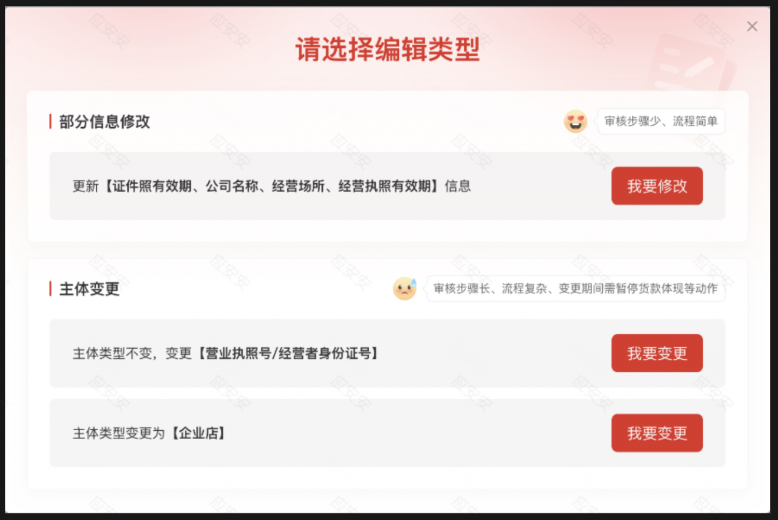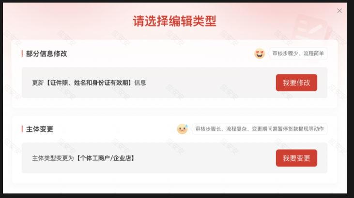 (四)部分信息修改审核通过后,线上即可生效;主体变更审核通过后,需前往卖家中心签署对应协议,签署完毕后即可生效