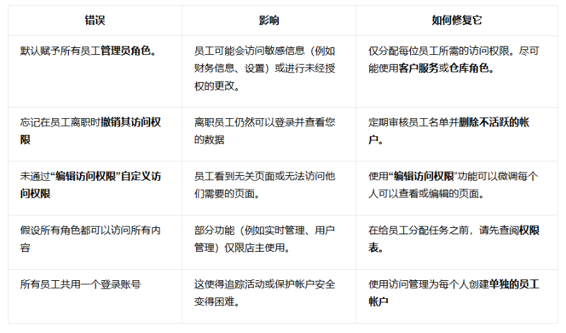 授予员工对店铺账户的完全访问权限可能存在风险。