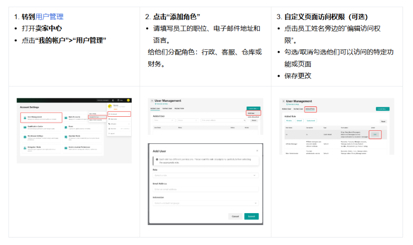 通过卖家中心的访问管理功能,您可以为员工分配角色,并控制他们可以访问哪些页面,从而确保效率和帐户安全。