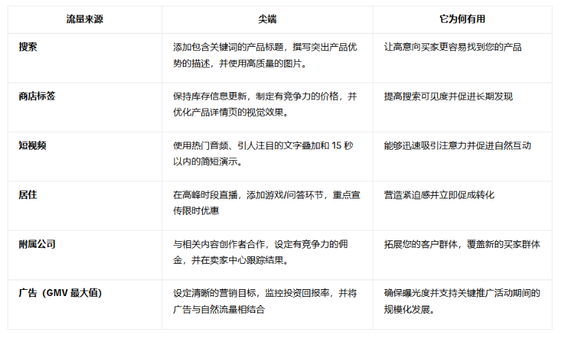 最后提示Tokopedia TikTok Shop 上的每种流量来源都扮演着不同的角色——有些带来即时转化,有些则有助于建立长期的品牌曝光。关键在于平衡:结合搜索和“商店”标签页提升曝光度,利用短视频和直播提升互动率,并通过联盟营销和广告实现规模化增长。