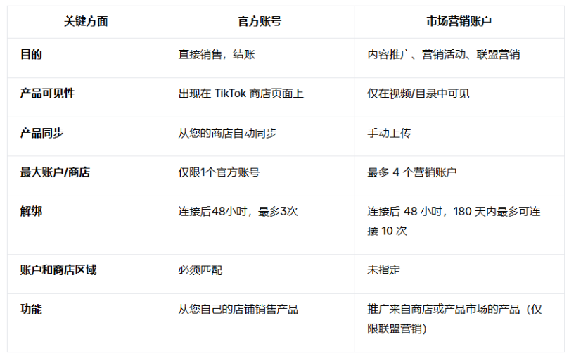 这两种账号类型用途不同。官方账号用于直接销售,而营销账号用于内容和活动推广。