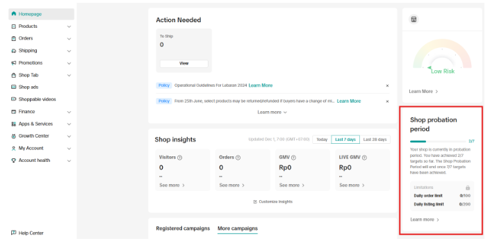 首次加入 Tokopedia TikTok Shop 时,您的店铺将进入店铺调整期。在此期间,部分销售功能将受到限制。此举旨在帮助新卖家夯实基础,确保产品质量,并给予他们更多时间进行调整,然后再扩大规模。