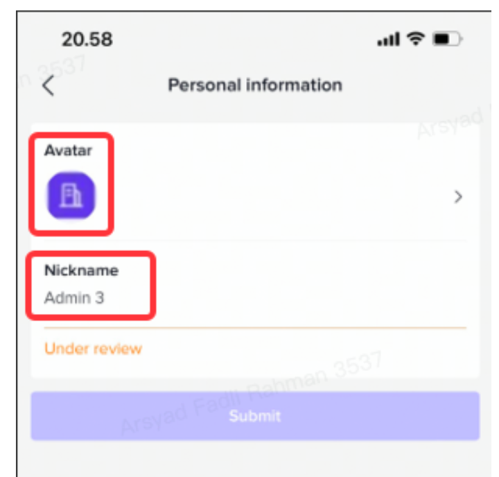 个人信息包括昵称和头像。提交后,系统将自动审核设置并显示“审核中”。