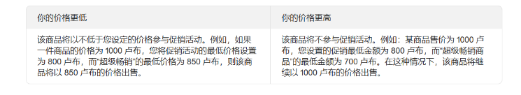 您可以设置促销活动的最低价格——即 Market 平台将商品价格降低到的最高限额,以此作为促销活动的参与门槛。这主要适用于买家能从 Market 平台获得最大折扣的商品。