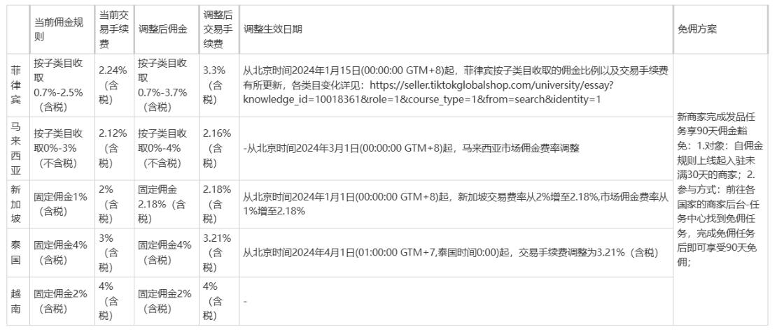 TikTok Shop 跨境东南亚平台佣金及交易手续费相关信息,包括各国当前及调整后的佣金和交易手续费标准、生效日期、免佣方案,详细解释了平台佣金计算方式、新商家佣金豁免政策以及交易手续费规则和计算方式。