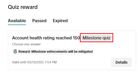 如您收到违规通知且该违规附有考试,则考试会自动显示在您的账号健康页面。参加考试的方法说明如下。