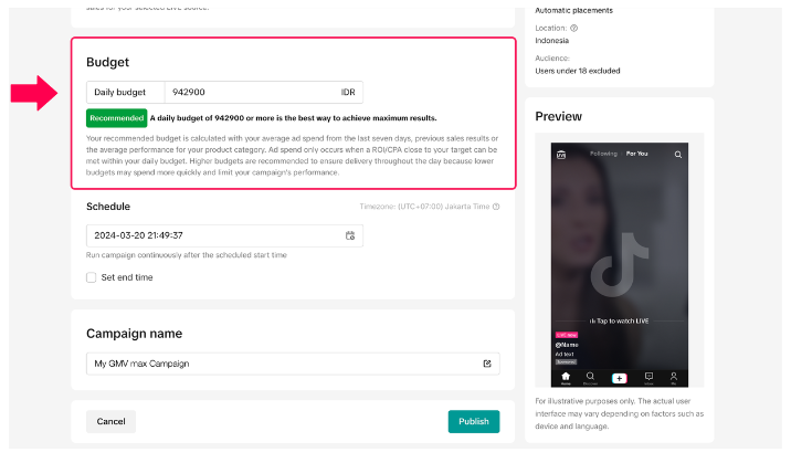 7、在“预算”板块,输入你想在推广系列上消耗的日预算。你可以选择使用建议的日预算,该金额基于你一段时间以来的直播效果计算得出。开始投放推广系列后,你可以随时调整预算设置。