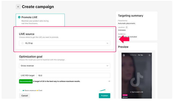 5 浏览该功能以直播间总ROI为核心优化目标,通过控制全链路广告位提升增量成交额。商家需具备管理员或广告权限,创建前需停投原有直播购物广告或GMV Max系列。设置时需选择推广的TikTok账号、设定ROI目标及日预算,系统支持建议值以提升投放效果,推广系列可按排期自动投放并实时查看数据。