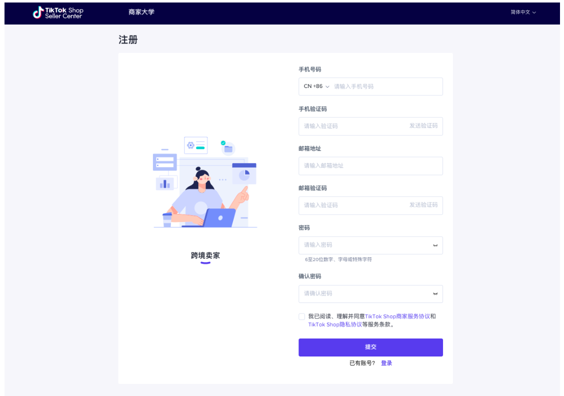 Step 1:注册店铺登陆账号全网唯一国内/海外手机号+邮箱注册链接:https://seller.tiktokglobalshop.com/account/register?channel=us_partner_chwang