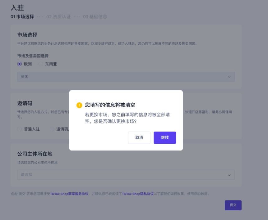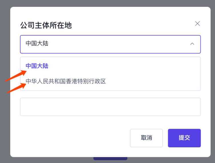 请您根据自己的营业执照和公司主体所在地进行选择平台提供两种选项:中国内地 or 中国香港此处的选择会影响【资质认证】环节提交的资料类型,即选择中国内地,提交内地资质,即公司营业执照选择中国香港,提交香港资质,即公司注册证明书、商业登记证