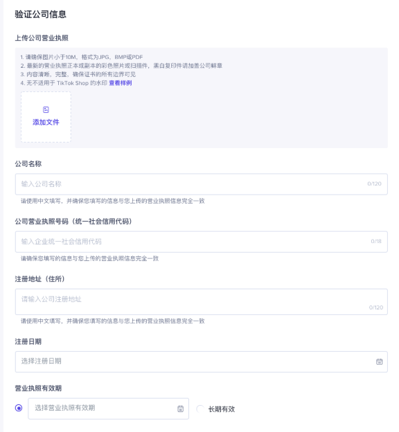 1)上传公司营业执照请注意:确保你上传的营业执照信息是清晰彩色照片,如上传黑白复印件需加盖公司公章。2)公司名称3)公司营业执照号码4)注册地址5)注册日期6)营业执照有效期中国香港资质