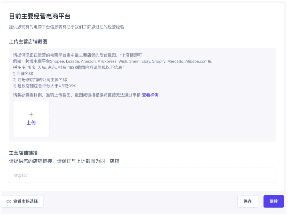 上传主营店铺截图跨境:Shopee/Lazada/Amazon/AliExpress/Wish/Shein/Ebay/Shopify/Mercado/Alibaba .com/OZON/Temu国内:拼多多/淘宝/天猫/京东/抖音/1688/快手截图内容需要包括:1)店铺名称;2)注册该店铺的公司主体或法人,请与注册TikTok Shop的公司主体或者法人一致;3)店铺DSR评分