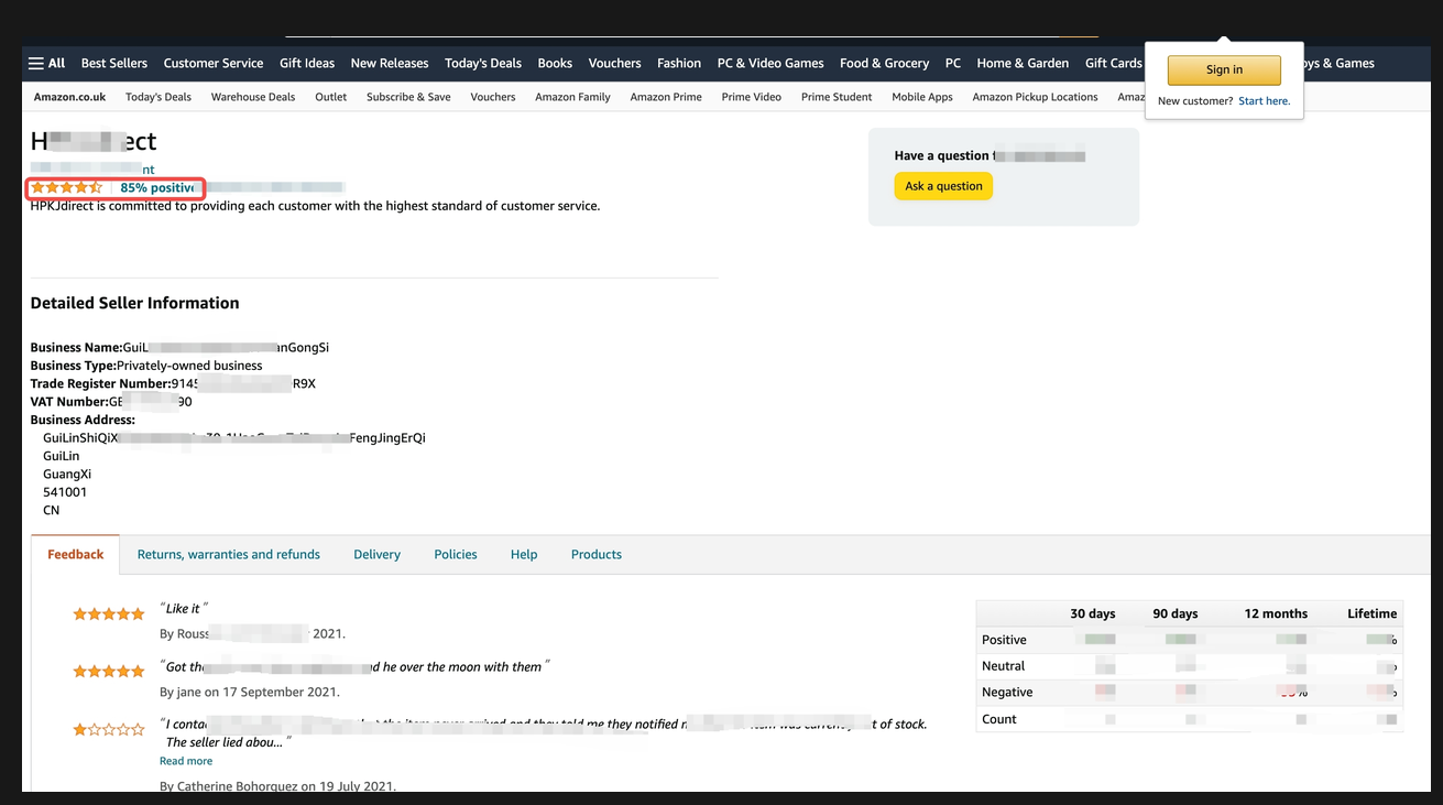 主营店铺链接链接店铺与截图店铺为同一个链接打开需包含展示:1)店铺名称;2)店铺评分第三方平台截图商家详细信息包括企业名称、企业类型、进口商注册编号、VAT编号、详细地址,DSR等。以下提供部分跨境平台截图示例,仅供参考:
