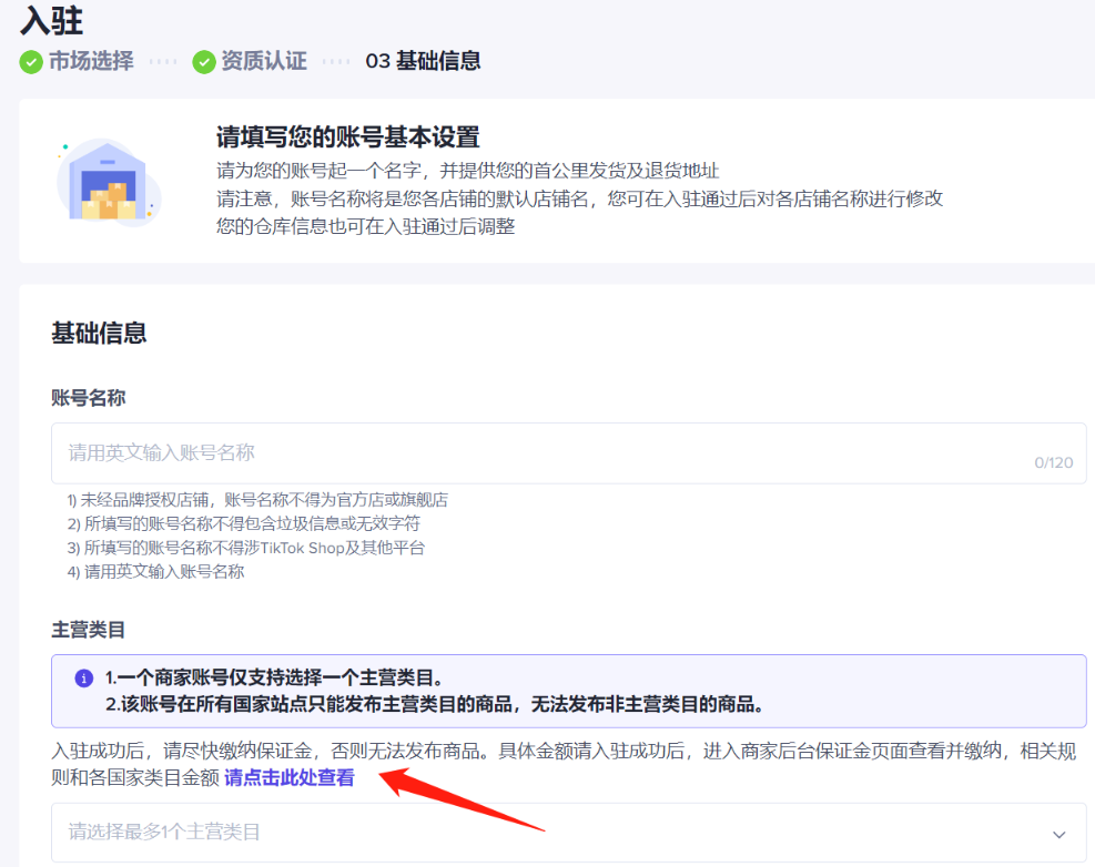 设置店铺名称,需是英文填写且全网唯一店铺注册成功后,需要注册与TikTok Shop命名一致的TikTok账号进行绑定。选择主营类目,一个商家账号仅支持选择一个主营类目,该账号在所有国家站点只能发布主营类目的商品,无法发布非主营类目的商品(选择完成后,会根据商家选择的主营类目显示所需缴纳的保证金金额。