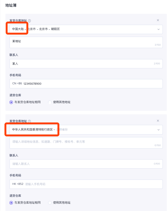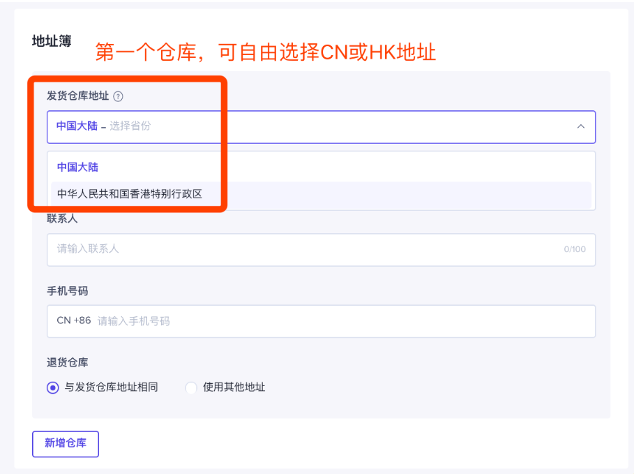 若第一个选择大陆仓,新增仓库(第二个仓库)仅能选择香港仓,反之同理