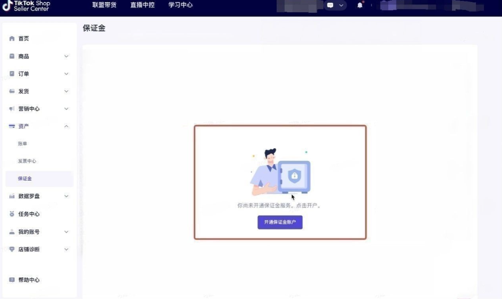 Step 5 缴纳保证金PC端登录商家后台>>资产>>保证金,进入到保证金页面。系统会自动替您开立保证金账户。卖家如果遇到系统自动开户失败的偶然情况,只需点击“开户保证金账号”按钮完成保证金开户。如点击后依旧无法完成保证金开户,请联系平台客服处理。