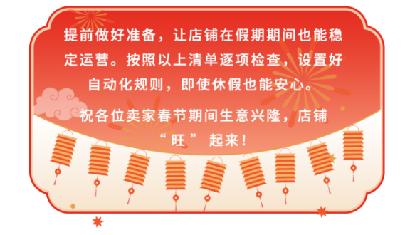 春节假期即将到来,海外买家购物需求依旧旺盛。为了帮助您在春节期间保持店铺稳定运营,请对照这份《亚马逊春节店铺运营指南》,做最后一遍紧急排查。设置好这些,过年"不打烊"!