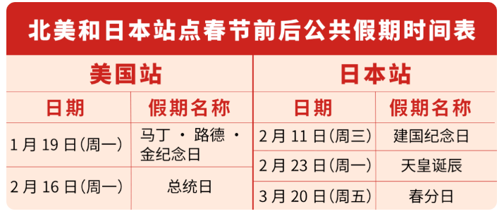 小编为您准备了北美和日本站点春节前后的公共假期时间表,请仔细查看: