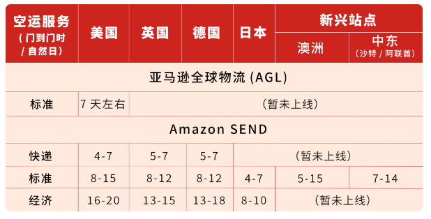 除了官方物流AGL,Amazon SEND预计从国内发往各站点需要的海运头程物流时效如下: