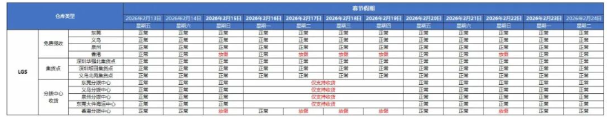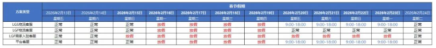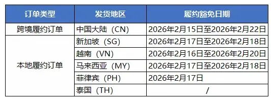 春节假期期间,平台在综合考虑发货地公共假期和保障商家发货优势后,将在下表中特定日期,豁免商家发货履约时效。并将2月23日(周一)、2月14日(周六)、2月28日(周六)纳入商家履约考核时间。