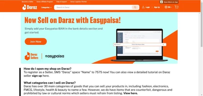 1、打开官网,点击首页上方“在Daraz上销售”。