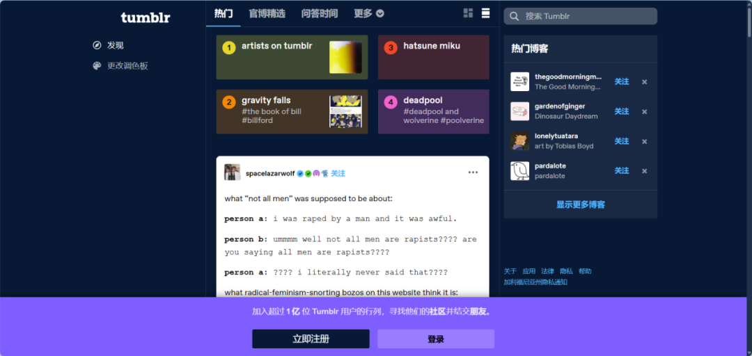在Tumblr上,用户可以自由地建立自己的社交网络,通过关注其他用户的博客,轻松追踪并浏览他们发布的最新文章。这种机制让用户能够即时获取到来自不同领域和兴趣爱好的新鲜资讯与独特见解。Tumblr社区因此成为了一个充满活力与创意的交汇点,汇聚了来自五湖四海、拥有多样背景和兴趣爱好的人们。在这里,用户可以找到与自己心灵相通、志趣相投的伙伴,丰富了Tumblr平台上的内容生态。
