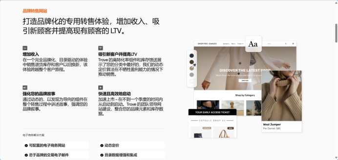 之后,Trove进行了战略调整与业务转型。Trove洞察到服装零售行业对于二手商品转售的潜在需求,于是将重心从个人市场转向了更为广阔的B2B领域。在这一转型过程中,Trove专注于为服装零售商提供全方位的白标(white label)服务,不仅帮助这些品牌商家制定和实施二手商品转售策略,还通过先进的技术和高效的物流体系为其提供强有力的支持。
