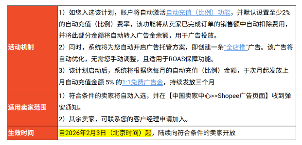 1月28日消息,Shopee跨境店近日发布信息,为提升卖家广告投放稳定性、避免因余额不足错失流量机会,Shopee菲律宾站点正式推出Shopee流量增长计划(Shopee Ads Growth Plan)。入选该计划的卖家将获得连续三个月的免费广告金激励,平台建议参与卖家保持开启自动充值(比例)功能及“全店推”广告以保障投放效果。卖家可自行关闭、开启或调整相关功能或广告,但若中途关闭自动充值功能将被视作退出计划,无法继续获得额外广告金。Shopee保留对计划的参与标准、活动机制及激励内容进行修订的权利,并会通过平台公告等方式通知卖家,建议卖家及时关注最新政策。
