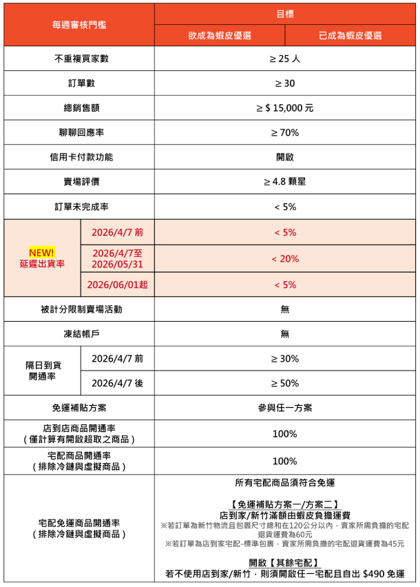 3月15日消息,Shopee台湾本土店发布最新通知,自2026年4月7日起,Shopee优选规范中“隔日到货”商品的开通率门槛将从原标准提升至≥50%。这意味着卖家在3月31日至4月6日期间,其“Shopee店到店隔日到货”商品的开通率需达到50%或以上,才能满足4月7日当周的“隔日到货”开通率要求。为配合此次调整,平台在4月7日至5月31日设置了缓冲期,期间优选卖家的延迟出货率门槛由<5%放宽至<20%。同时,针对在此期间因“隔日到货”订单延迟出货而产生的计分,卖家可事后申请豁免,以便有充足的适应时间。平台提醒,自2026年6月1日起,缓冲期将正式结束,平台将全面恢复原有规范。正常计分门槛仍维持为:延迟出货率<5%,“隔日到货”延迟出货率<10%。