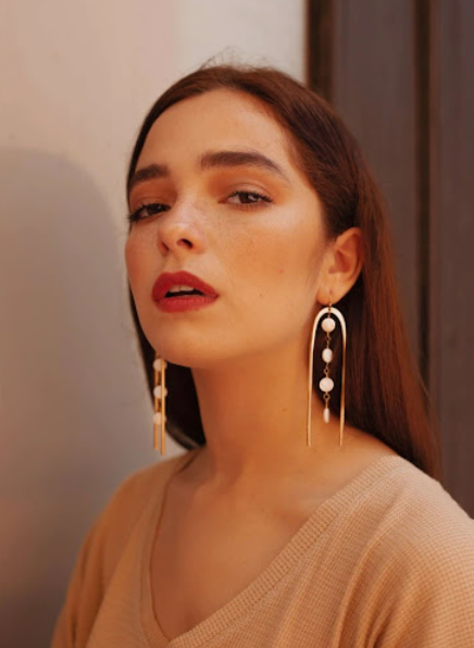 耳环呈高挑纤细的拱形,垂至模特颈间。拱形柱之间垂挂着一串小巧的珍珠母贝吊坠。这些珍珠吊坠自由垂落,并通过与拱形相呼应的金属链连接。