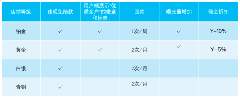 优质店铺等级除了享受回款周期增多的权益之外,铂金和黄金店铺还分别享受Y-10%和Y-5%的佣金折扣*。基于此,优质店铺等级商户的资金回款次数和资金量都在提升,其资金利用率将大有改善。