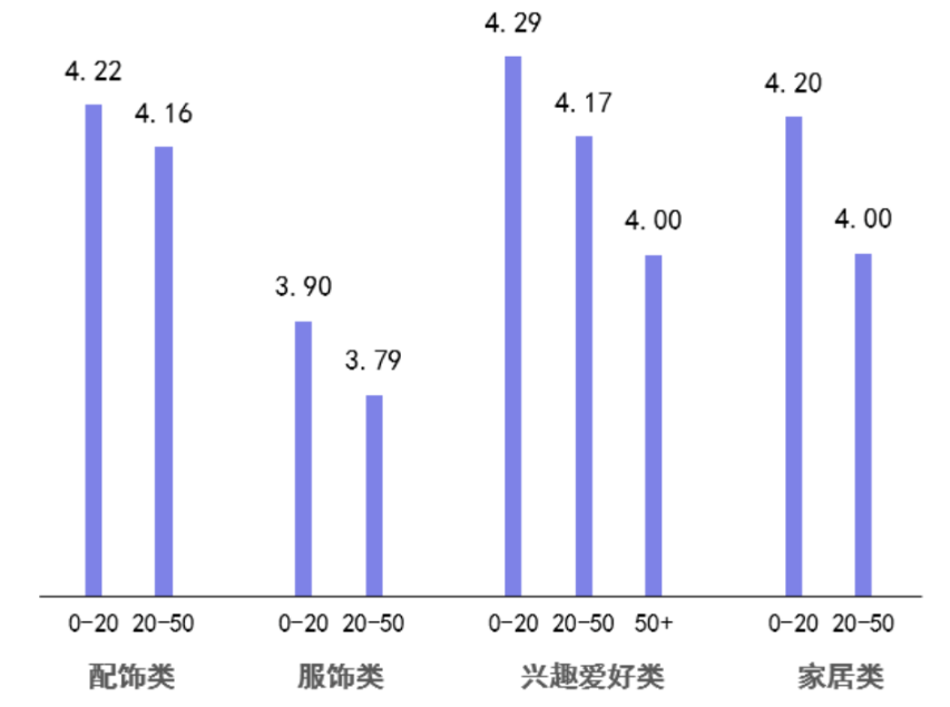 不同品类、不同价位的产品情况也不太一样。通常来说,中低价格段的产品的产品评分会好于高价格段的产品用户评分(可能是因为用户对于高价格的产品的期待和要求也更高)。