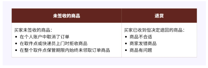 未签收的商品和从买家处收到的退货将退还给卖家。