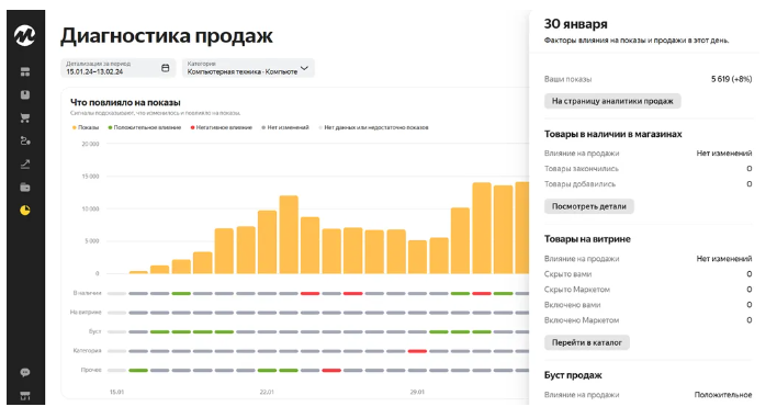 该报告展示您在 Yandex Market 的销售动态:买家点击您商品详情页的频率、加购商品数量、哪些商品最畅销、哪些商品需优化。利用该报告可评估推广效果——包括广告、参加促销活动、大促或博主合作的成效。