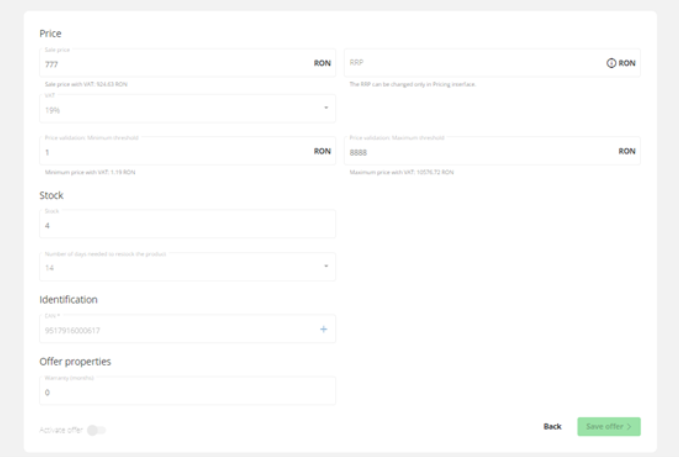 价格和库存 ——产品文档获得批准后,您可以在此处添加待售产品的报价。