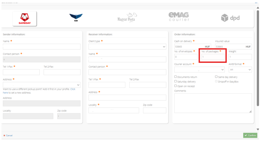 选择负责配送产品的快递公司。在 “订单信息”部分,请在“包裹数量 ”栏中填写 您为此订单准备的包裹数量。