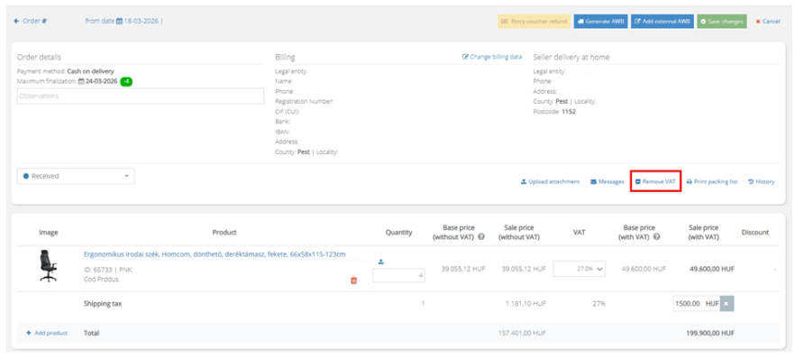 如果您在总部所在地以外的平台上销售产品(例如,您是匈牙利卖家,但在罗马尼亚平台上销售产品),并且客户是法人实体,而您的公司拥有欧盟内部增值税,则发票上无需包含增值税,并且必须将金额退还给客户。