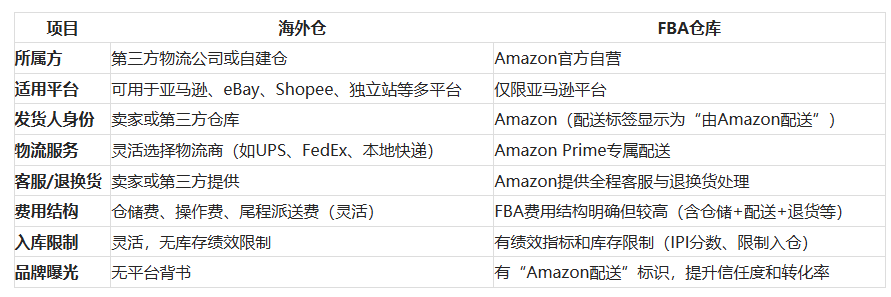 海外仓与FBA仓库(Fulfillment by Amazon)是跨境电商中两种不同的仓储及履约方式,它们在运营模式、服务内容、适用平台、费用结构等方面存在显著区别。以下是详细对比: