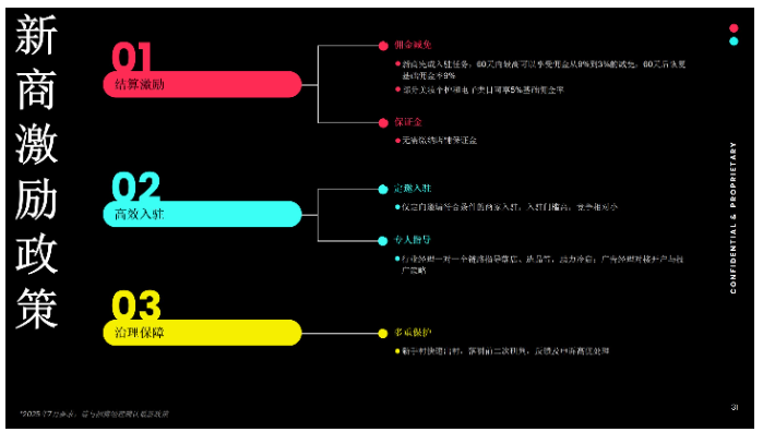 佣金减免:新商完成入驻任务后,60 天内佣金可从 9% 减免至 3%(60 天后恢复 9%);部分美妆个护、电子类目享 5% 基础佣金率