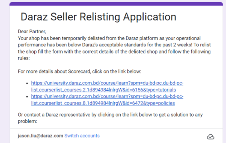 平台将会在每月3日/18日前后通过邮件、卖家中心通知发送申诉链接(Relist link)给当期Temp Delist(临时下线)等级卖家,如下图所示;