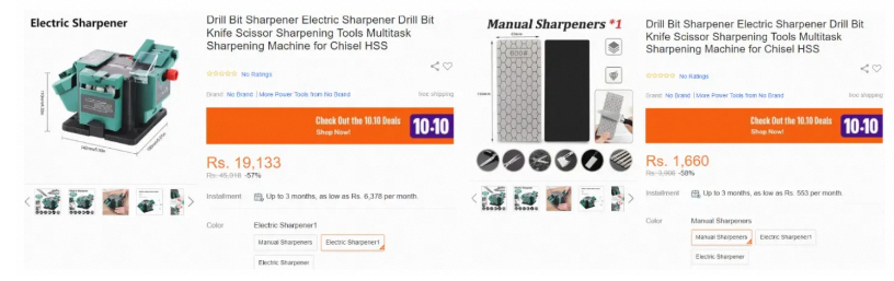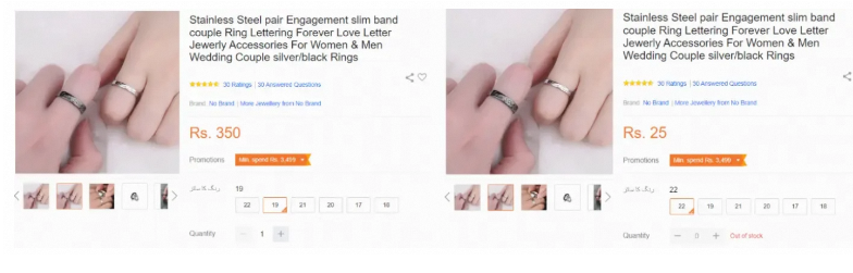 图示中的商品有多种变量型号,其中#22价格设置为 Rs.25.且无可售库存,其他变量为正常售价 Rs.350